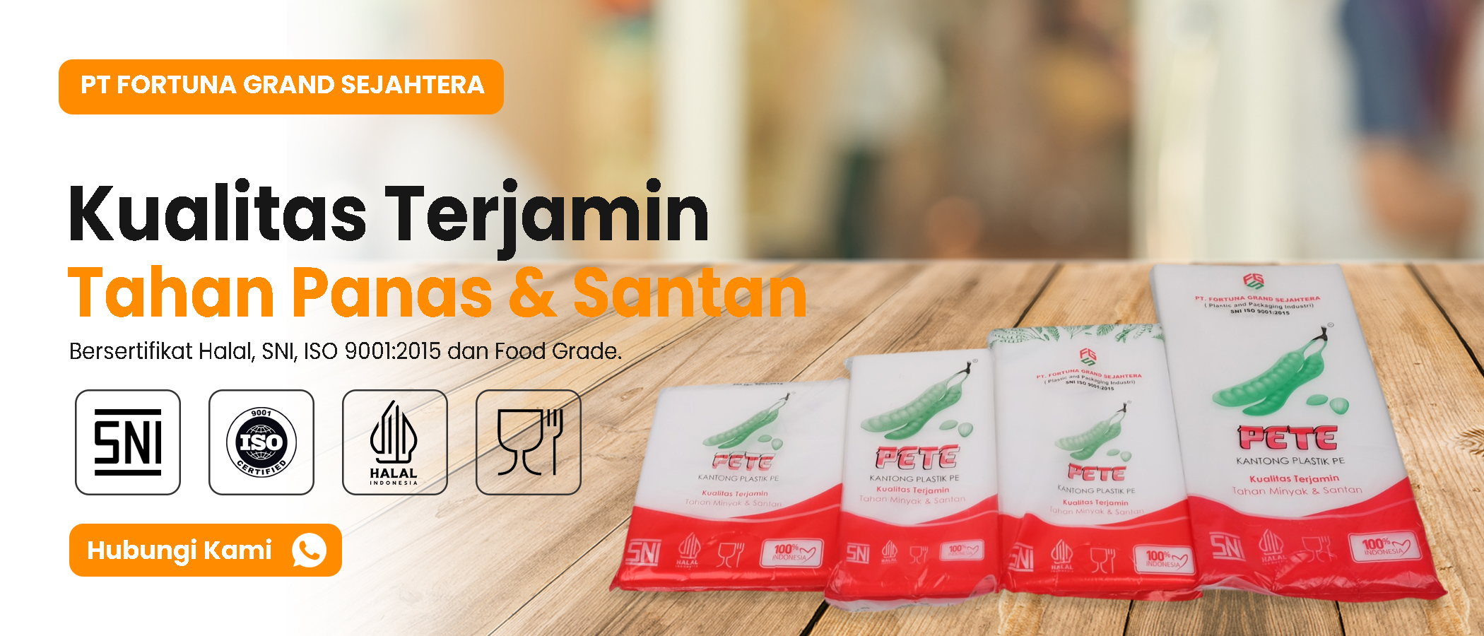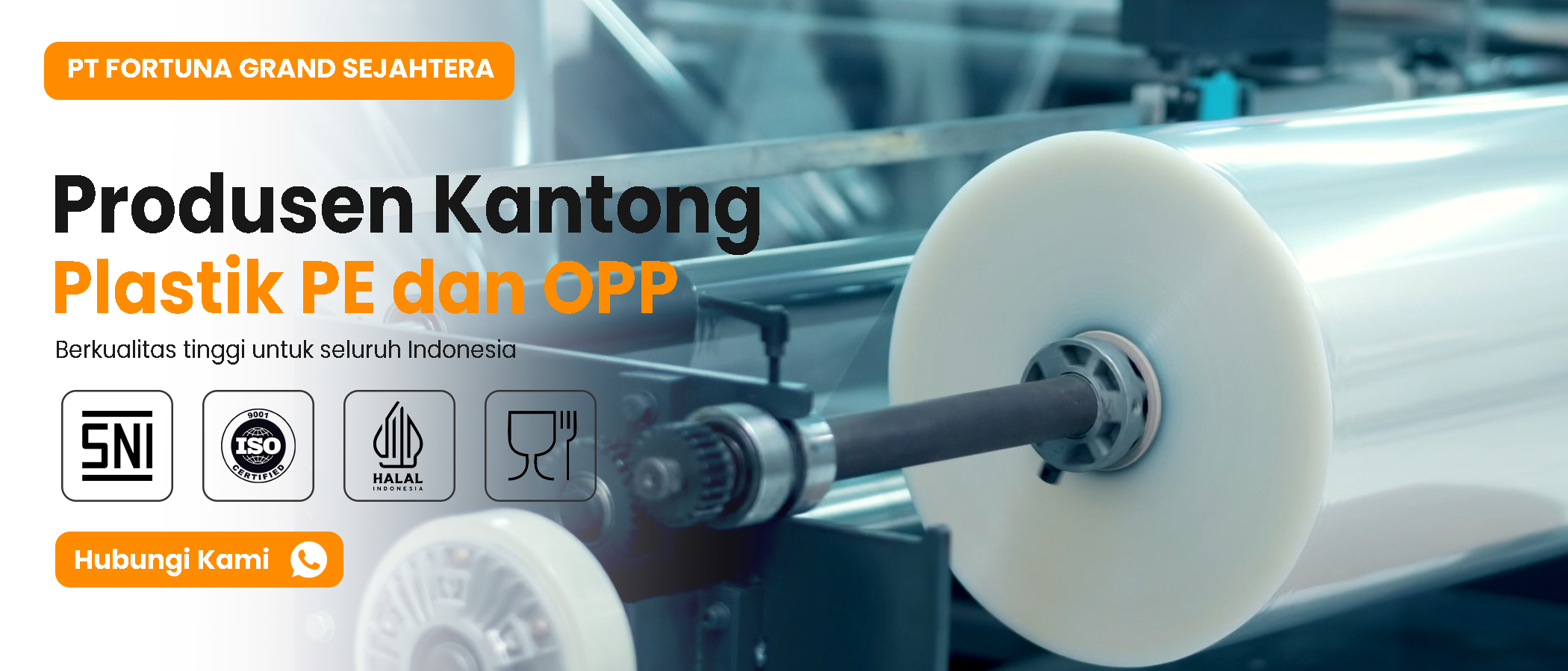 PT Fortuna Grand Sejahtera (FGS) adalah produsen kantong plastik PE dan plastik OPP yang berpusat di Surakarta, Jawa Tengah. Dengan pengalaman bertahun-tahun di industri plastik & packaging, kami menghadirkan produk berkualitas tinggi di bawah brand PETE (kantong PE) dan FGS (plastik OPP) — tersertifikasi SNI, ISO 9001, Halal, dan Food Grade. Melayani pembelian ecer maupun grosir untuk kebutuhan rumah tangga, retail, hingga industri skala besar di seluruh Indonesia.